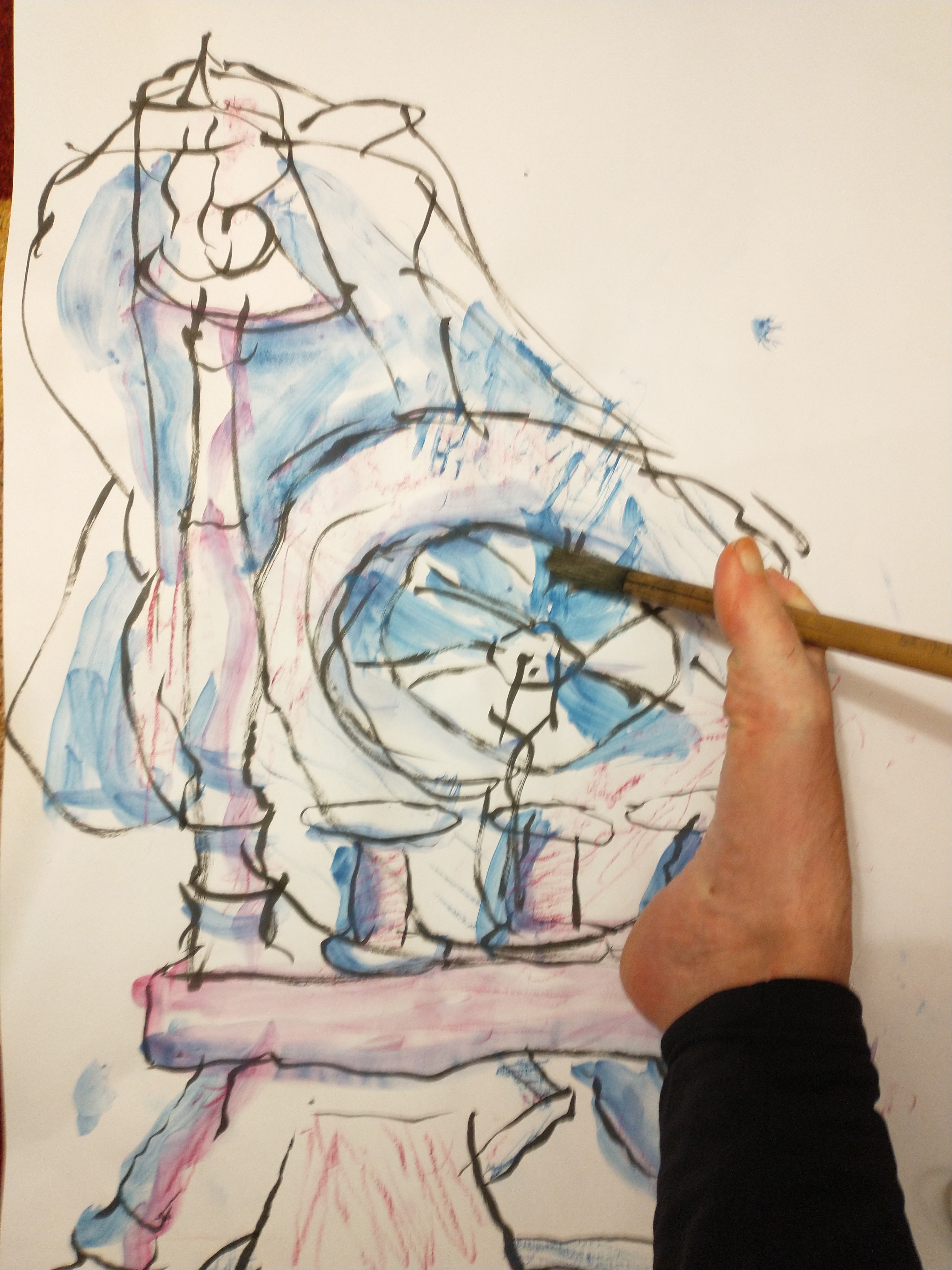Just some things we’ve played with: ways of framing a composition, mark making experiments, measuring, perspective, colour theory, watery media, pens, doodling, choosing subjects, even drawing with our feet and mouth!